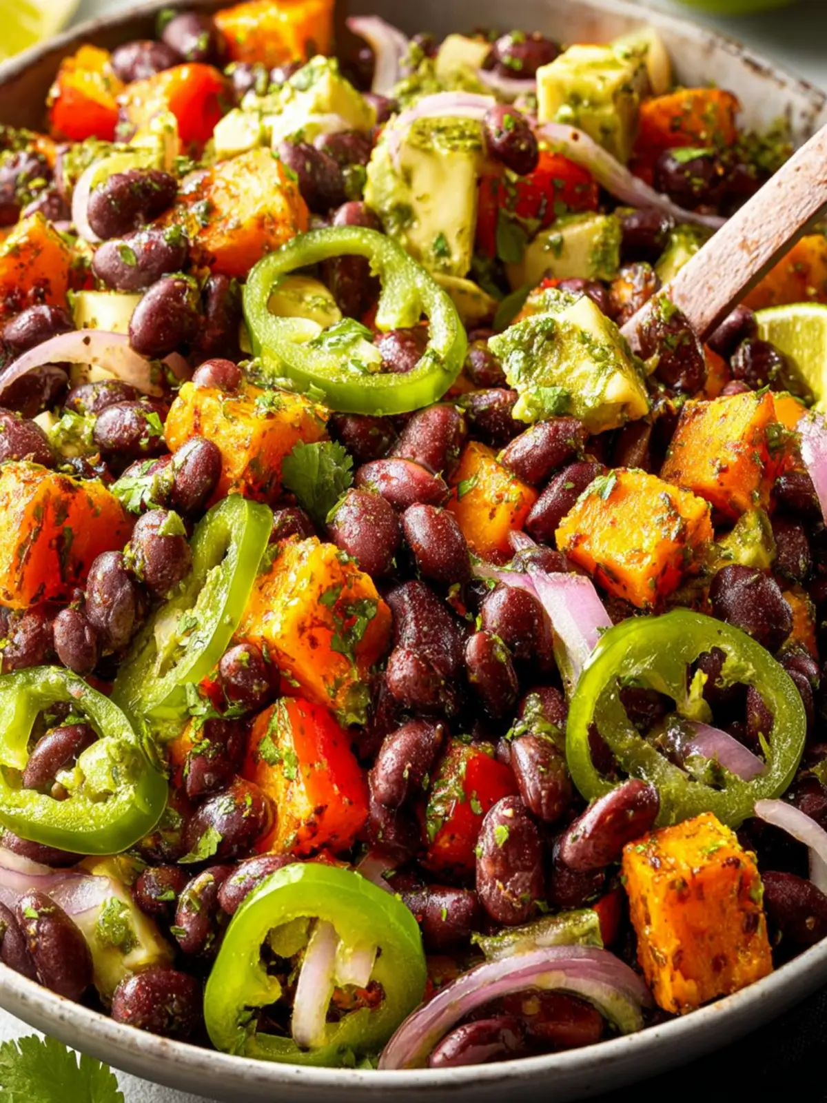 - Assemble the salad: In a large bowl, toss beans, sweet potatoes, 1 cup green bell pepper, ½ cup red onion, ¼ cup pickled jalapeños, ½ cup canned corn kernels, and 1 avocado with dressing. Toss gently and adjust seasoning to taste.