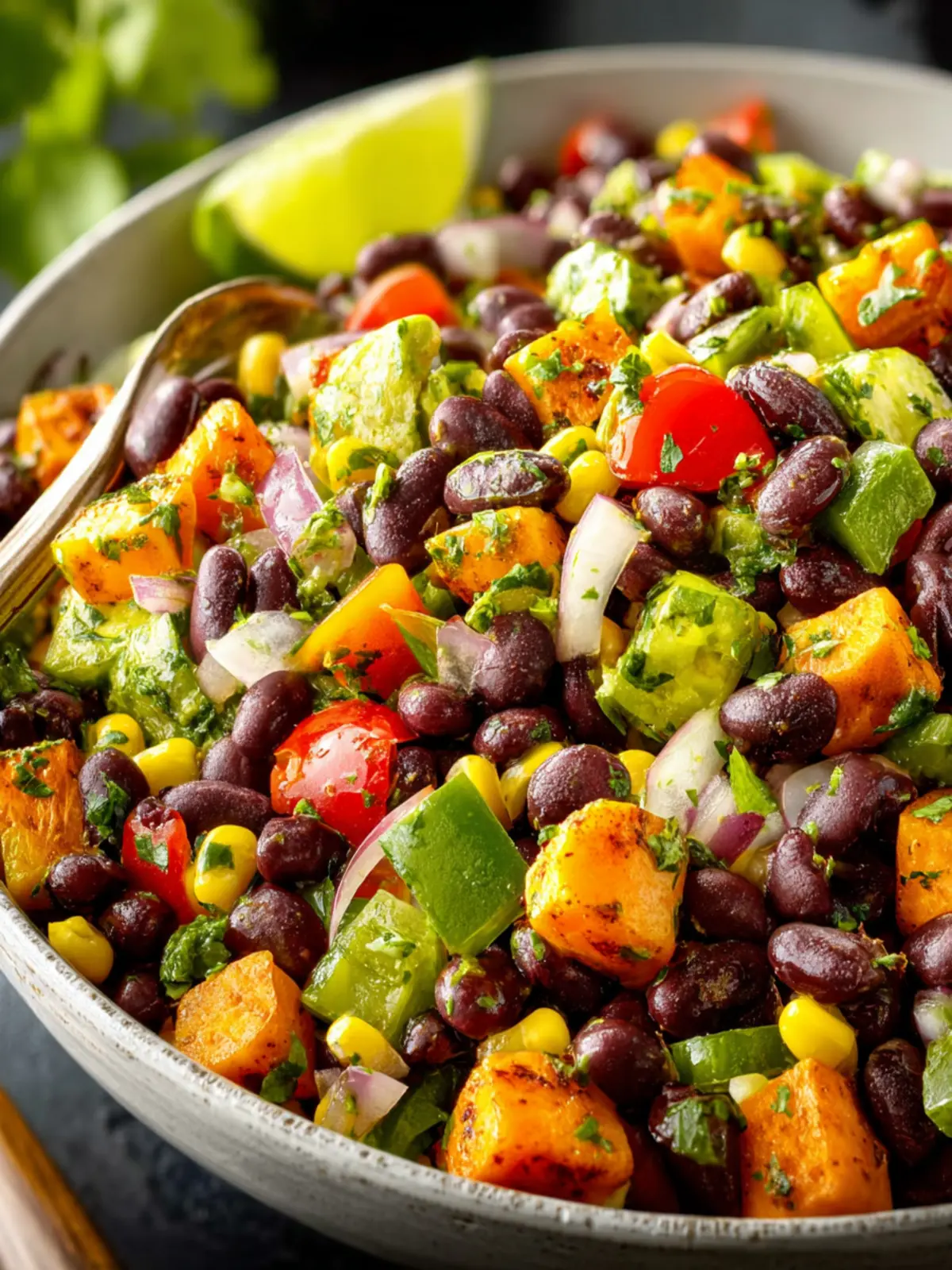A delicious and healthy salad featuring black beans, sweet potatoes, and fresh vegetables, topped with a tangy dressing.