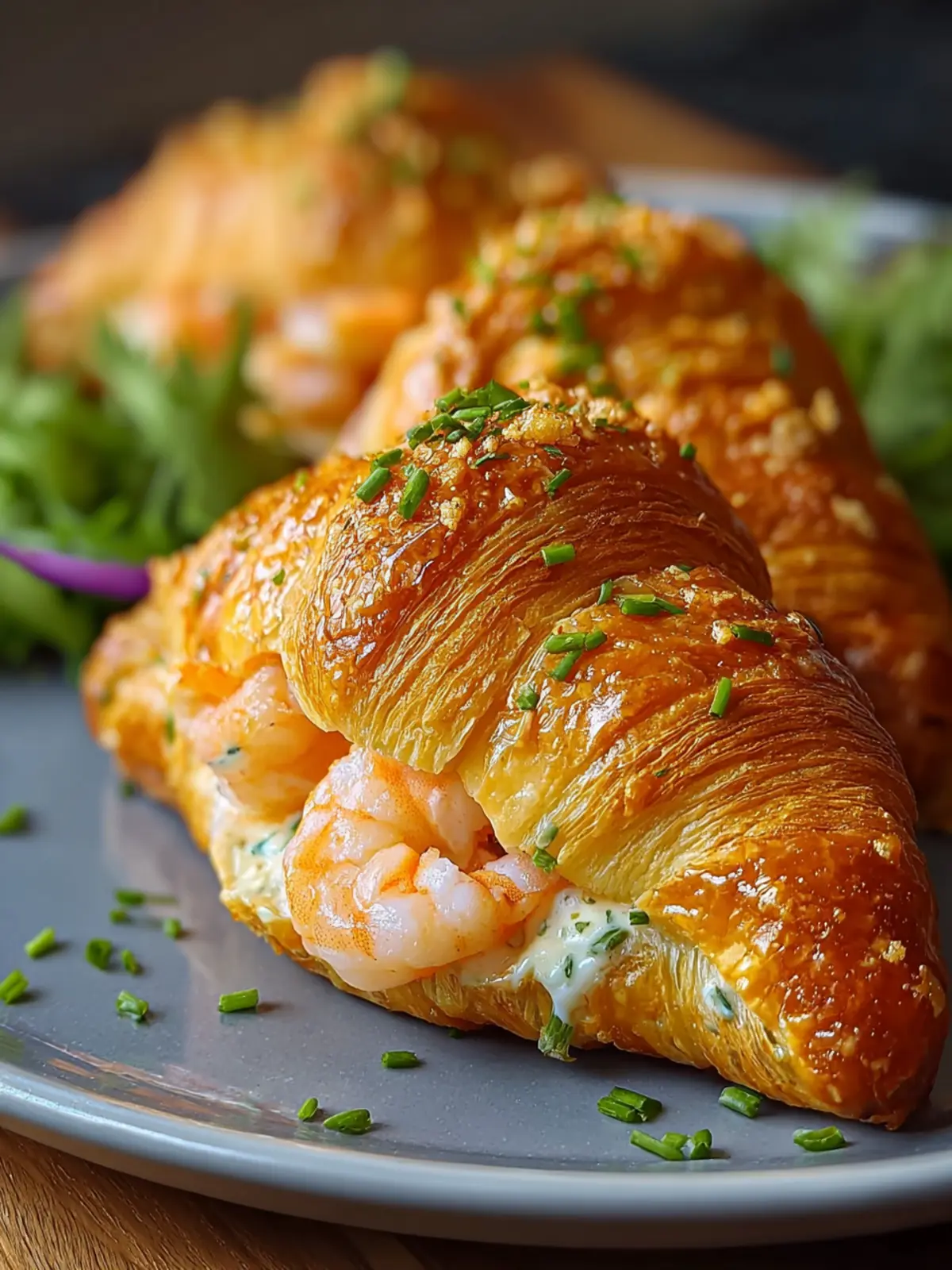 Delicious croissants stuffed with shrimp, cream cheese, and chives.