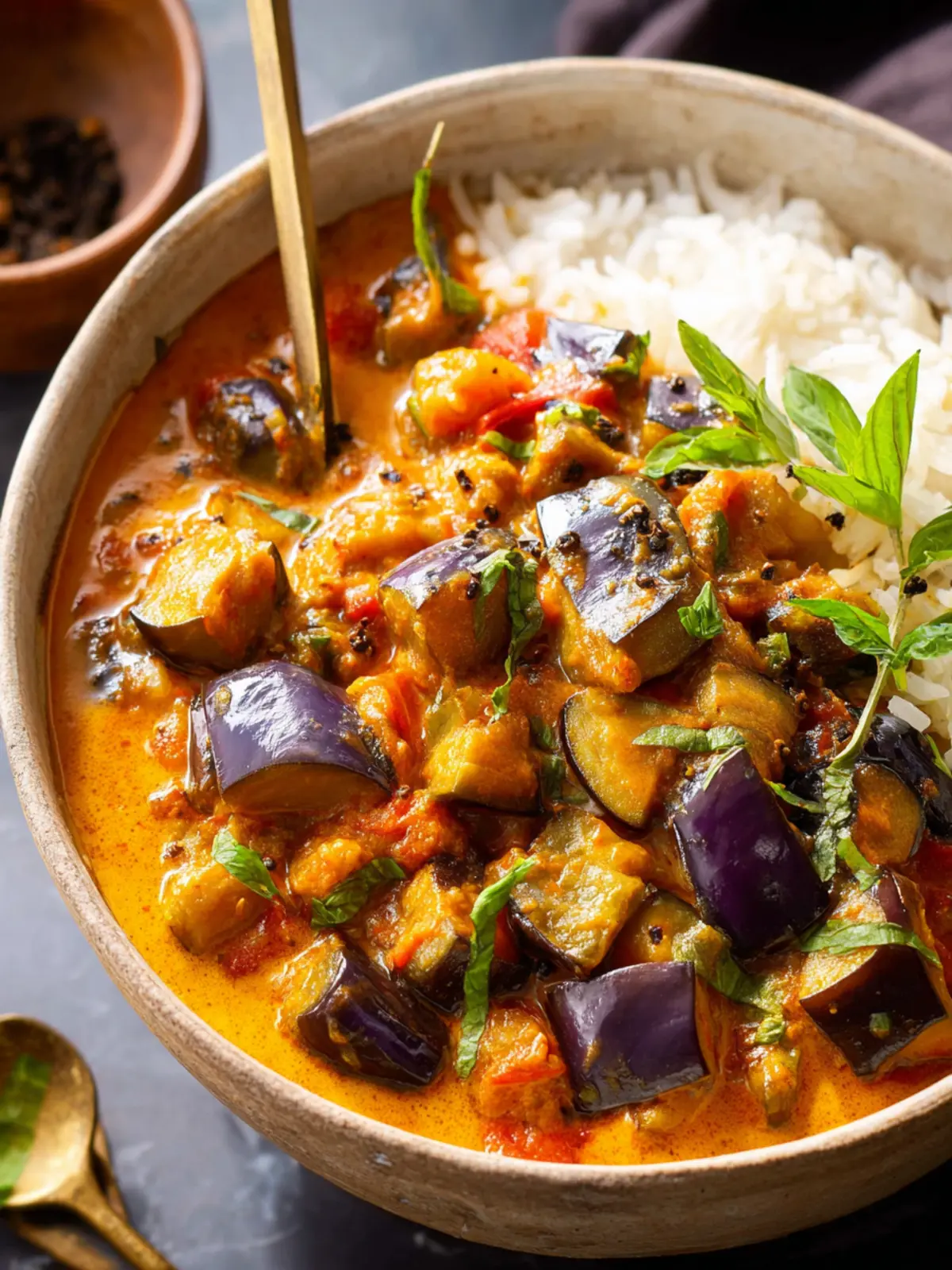 SERVING SUGGESTIONS: Serve eggplant curry with fluffy basmati rice or warm naan bread, garnished with squeezed lemon or lime juice, a dollop of plain or Greek yogurt, and a pinch of fresh cilantro.