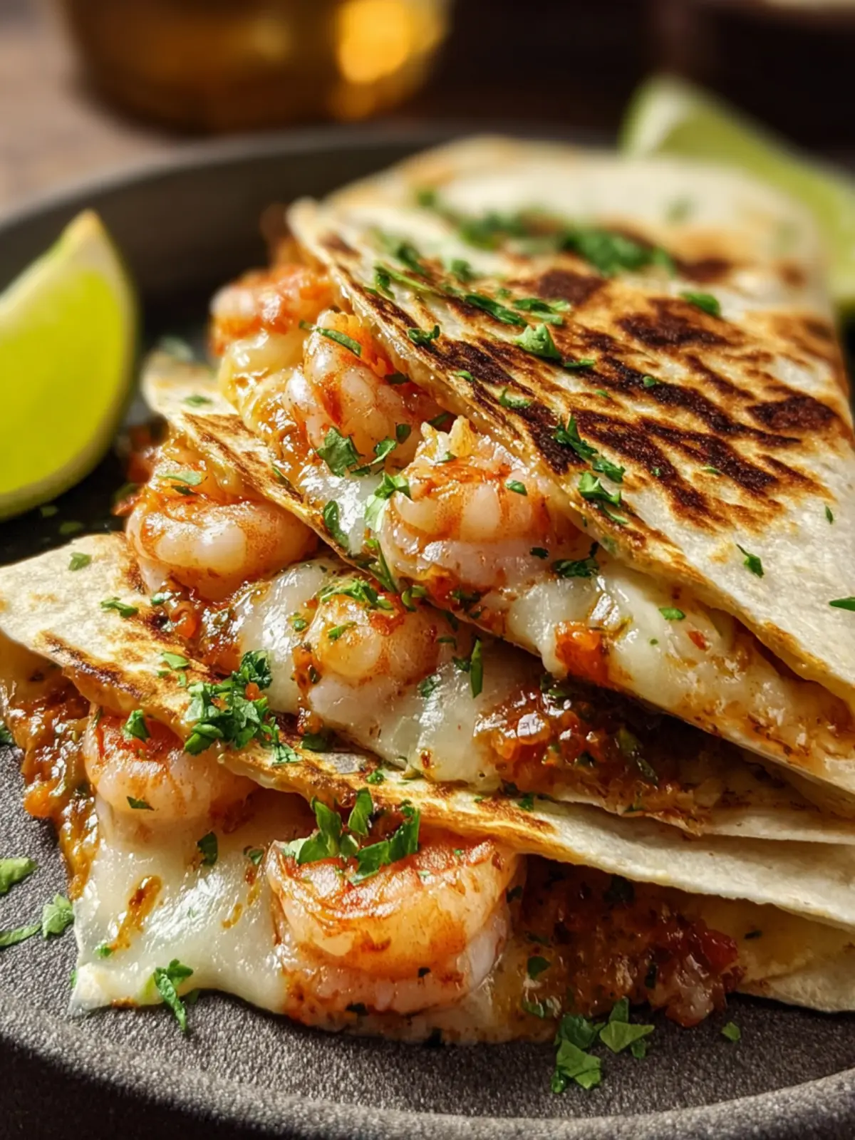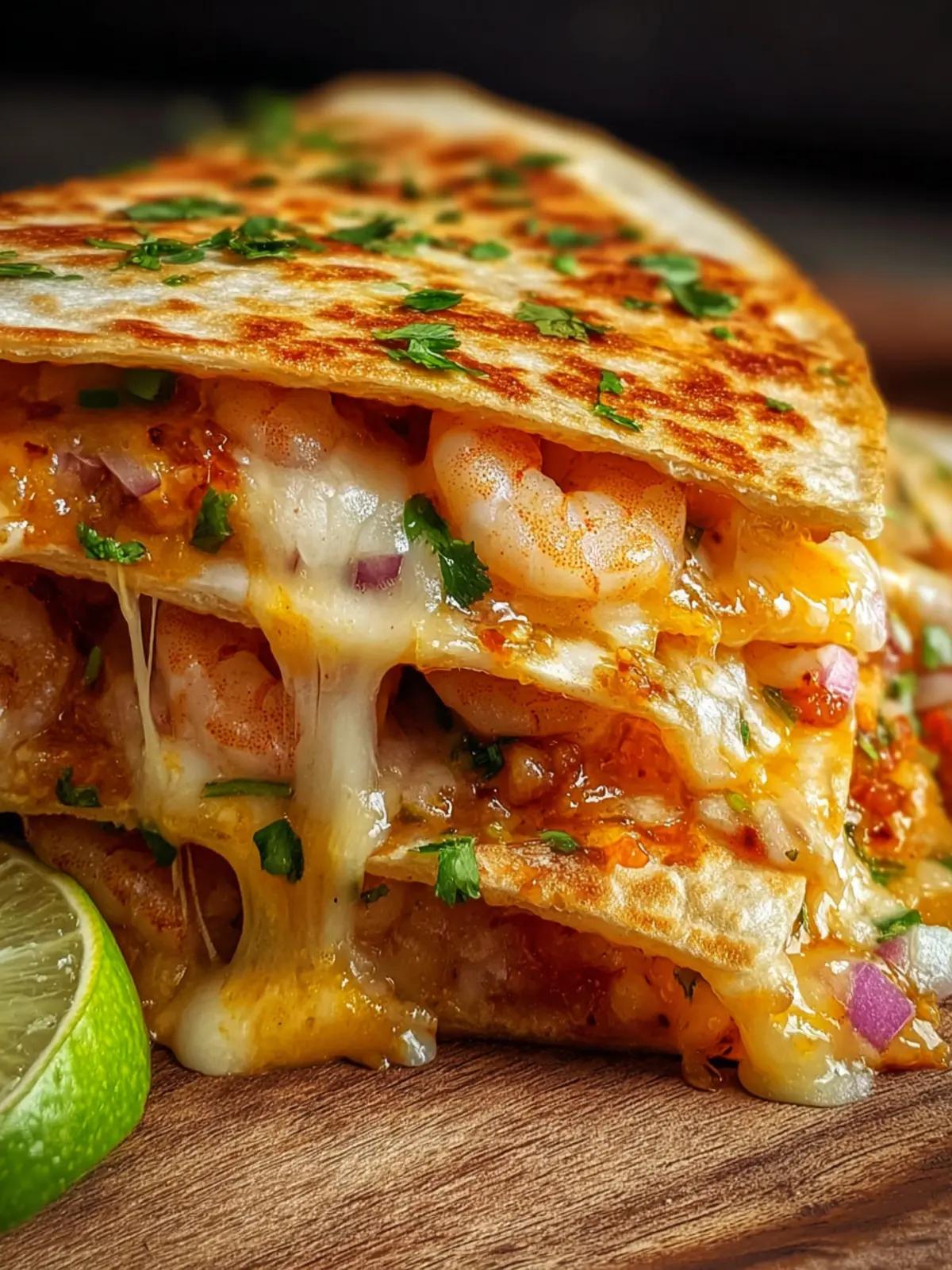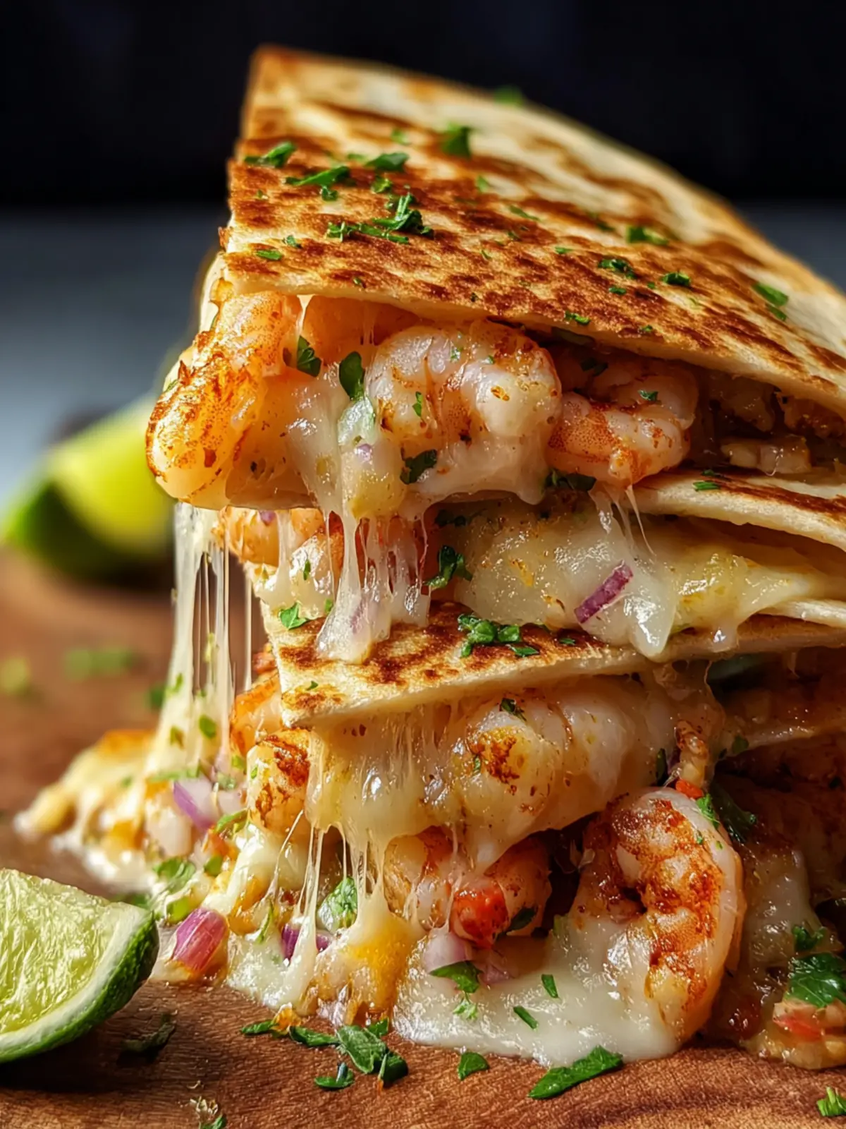 Delicious shrimp quesadillas with a tasty filling of sautéed shrimp and vegetables, topped with shredded cheese.